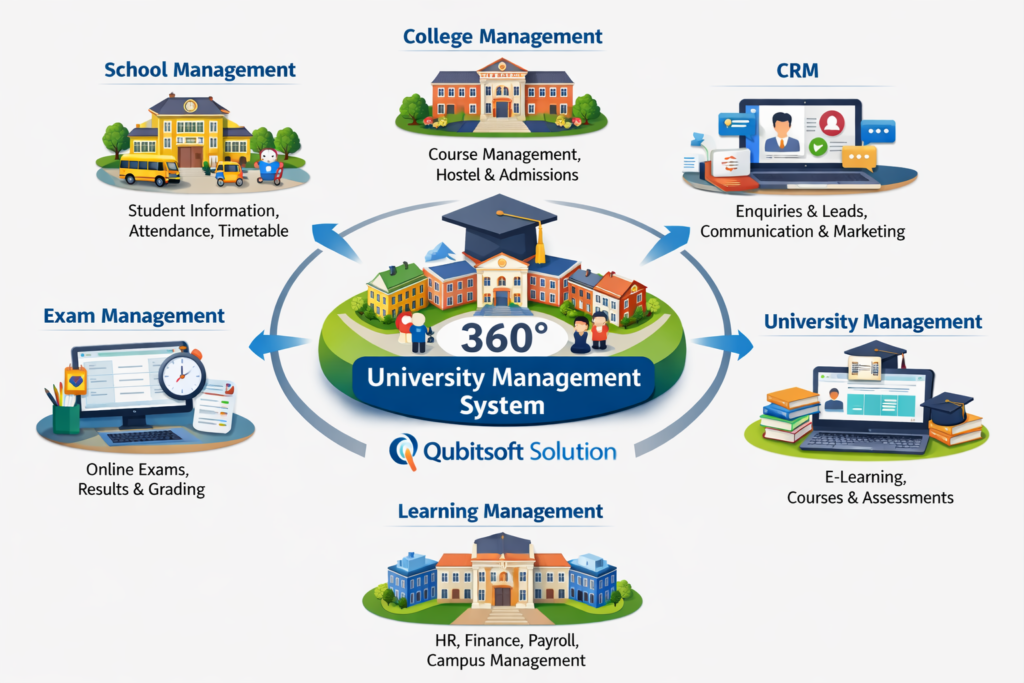 Qubitsoft Solution offers a robust and future-ready Education Management System tailored to the diverse needs of institutions across all levels. Our solution seamlessly integrates School Management, College Management, University Management, CRM, Exam Management, and Learning Management Systems (LMS) into a single unified platform.